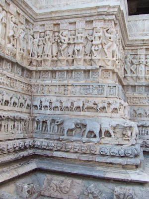 Ultima parada del recorrido en coche. Otras 7 horas de viaje. Una parada inesperada en el camino. Ranakpur. Un templo jainista de lo mas flipante que vimos en la india. Todo labrado en marmol, cientos de columnas todas diferentes y cupulas imposibles tambien talladas en marmol. Bastante graficas las orgias de los frescos de la entrada.