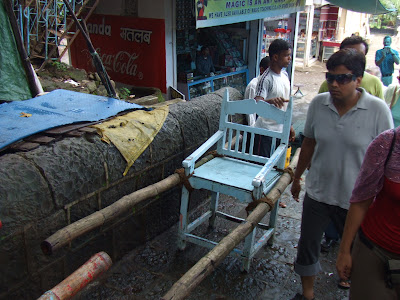 Al dia siguiente nos pillamos un barco y nos fuimos a isla elefante a ver las cuevas. Un trayecto interminable que nos recordaba el sopor de la carretera. Al llegar vemos un trenecito turistico esperaba en el puerto y nos temiamos una pateada brutal hasta las cuevas. Haciendo gala del ingenio local, el tren solo tenia via para un recorrido de 100 metros !?!?! Al llegar al final unos porteadores podrian subirte unas escaleras en balancin. Lo de jamos para otros tiempos coloniales.